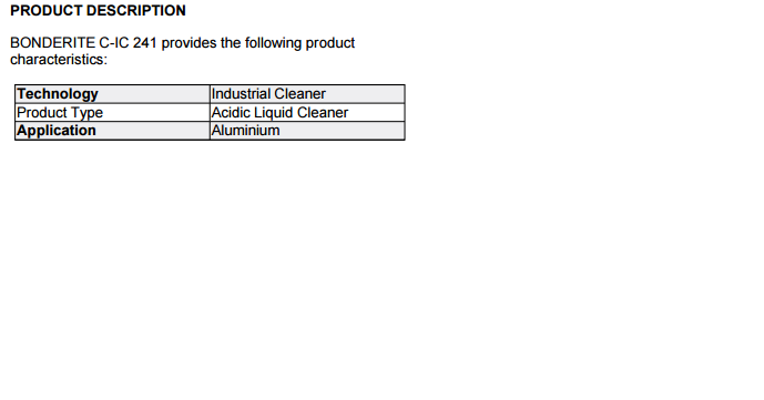 BONDERITE C-IC 241 is a one pack liquid acid product studied for spray or dip cleaning / deoxidizing / brightening treatments of Aluminium.