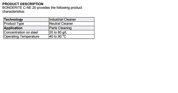 BONDERITE C-NE 20 is an aqueous neutral cleaner. It is composed of salts of organic acids, non-ionic surfactants and alkanolamine. The metal working industry, machine construction, automotive industry, electronic industry, hardening plants a.o. Final and intermediate cleaning in immersion processing, with and without ultrasonics. Removal of cooling lubricants, punch and drawing agents, lap and honing residues as well as polishing paste and grinding soil. Cleaning of span worked parts made of stainless steel, steel, copper, aluminium and zinc alloys. Treatment with P3-galvaclean 20 generates a hydrophobic film on metal surfaces which accelerates drying when used in the final cleaning stage.