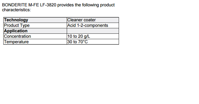 BONDERITE M-FE LF-3820 forms on the treated surface an amorphous phosphatic coating, mainly composed by iron phosphates, which provides good adhesion for liquid, powder or electrophoretic paints.