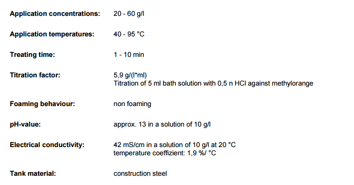 Removal of grinding and polishing paste residues, resinified oils and drawing phosphate films from steel by spraying and by immersion with or without ultrasonics. In electrolytical degreasing plants for the removal of pigment residues and for activating the steel surface.